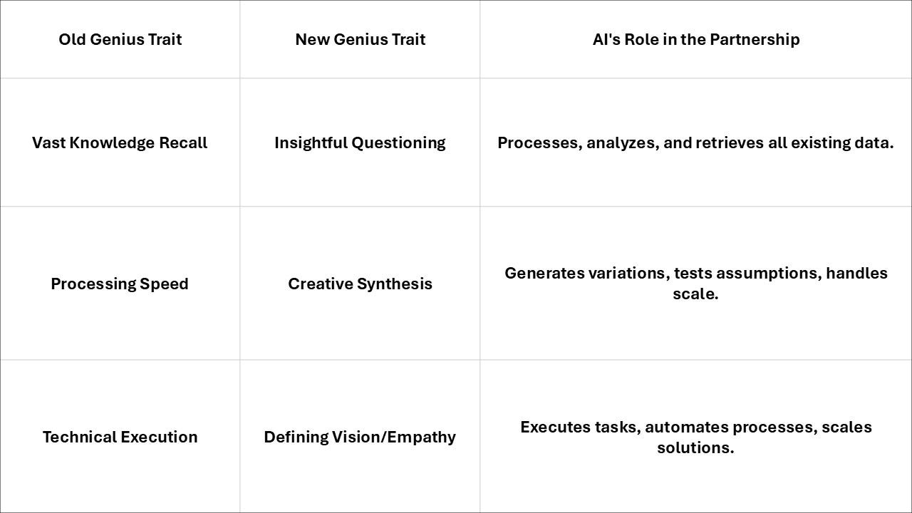 If AI is a perfect student with a memory for every textbook, creative, visionary, and bringing things to life that may not happen otherwise, then the new genius is the master architect of the question.